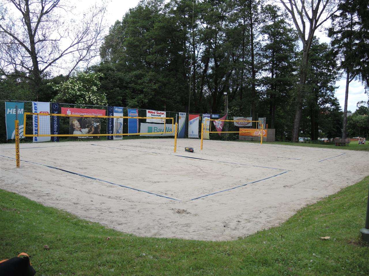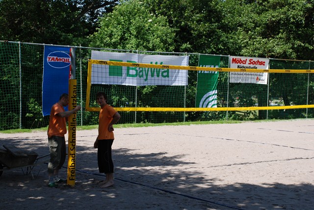 Die Beachvolleyballanlage wurde 2009 von einigen begeisterten Beachvolleyballern aus unserer Gemeinde in Eigenleistung saniert. Dank großzügiger Spenden von Einwohnern, dem Badförderverein und ortsansässigen Firmen sind erst einmal 200 Tonnen Erdreich abgetragen wurden. Im Anschluss wurde eine Drainage für beide Spielfelder verlegt und die gesamte Baugrube mit Drainagevließ ausgelegt, um ein Vermischen des Erdreiches mit dem Quarzsand zu verhindern. Nach Einbau der Netzpfosten wurden dann fast 300 Tonnen Quarzsand, aus einem Zwischenlager, auf die Volleyballanlage transportiert und in Handarbeit verteilt, da die Technik im Quarzsand keinen Halt fand. Danach wurde um die gesamt Fläche Mutterboden aufgefüllt und die Spuren der Bauarbeiten im Freibad beseitigt.
